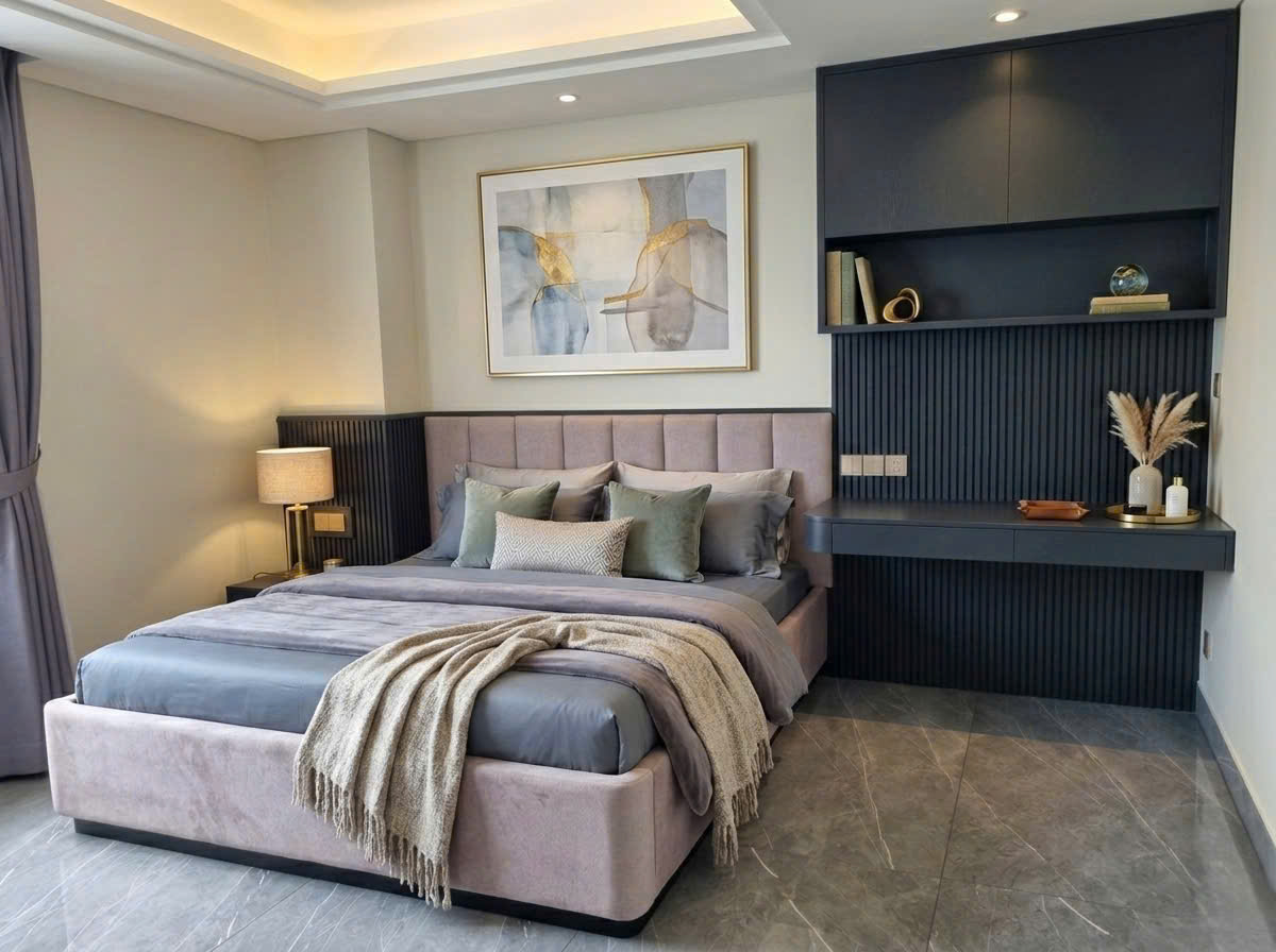 Thiết kế khung giường thấp, bo gọn các cạnh giúp tổng thể trở nên thanh thoát, phù hợp với không gian phòng ngủ hiện đại, căn hộ cao cấp hoặc villa tối giản. Kết cấu khung xương gỗ tự nhiên chắc chắn, sản xuất theo quy trình kiểm soát chất lượng nghiêm ngặt, đảm bảo độ bền và sự ổn định lâu dài.