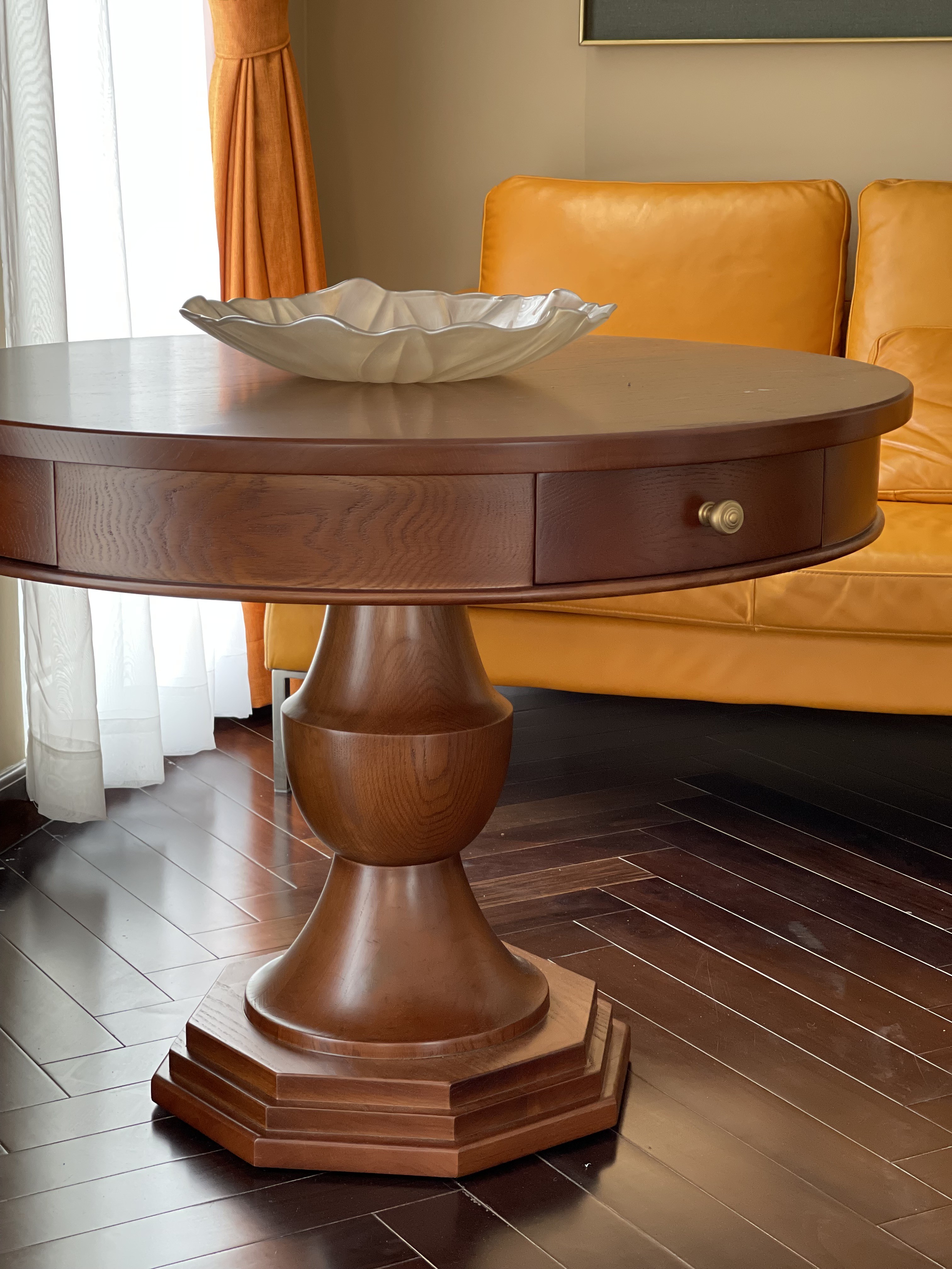 Thiết kế chân bàn là sự kết hợp hài hòa giữa đường cong mềm mại và khối đế chắc chắn, tạo cảm giác vững chãi mà không thô cứng. Chân bàn có dạng trụ lớn, đặt trên đế hình đa giác độc đáo, giúp chiếc bàn nổi bật ngay từ cái nhìn đầu tiên. Phần thân bàn được tích hợp ngăn kéo nhỏ tiện lợi, với tay nắm kim loại tinh tế, phù hợp để cất giữ những vật dụng nhỏ gọn như khăn ăn, điều khiển hoặc sổ tay.