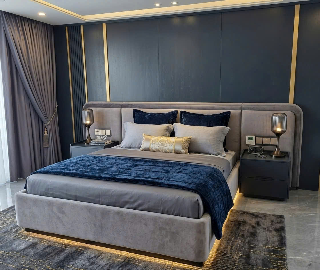 Không gian phòng ngủ được thiết kế theo phong cách hiện đại cao cấp, kết hợp bảng màu xanh navy – be trung tính tạo nên tổng thể thanh lịch và đầy chiều sâu. Điểm nhấn nổi bật là hệ vách đầu giường ốp panel lớn phối lam kim loại ánh vàng, mang đến cảm giác sang trọng, tinh tế nhưng vẫn ấm áp.