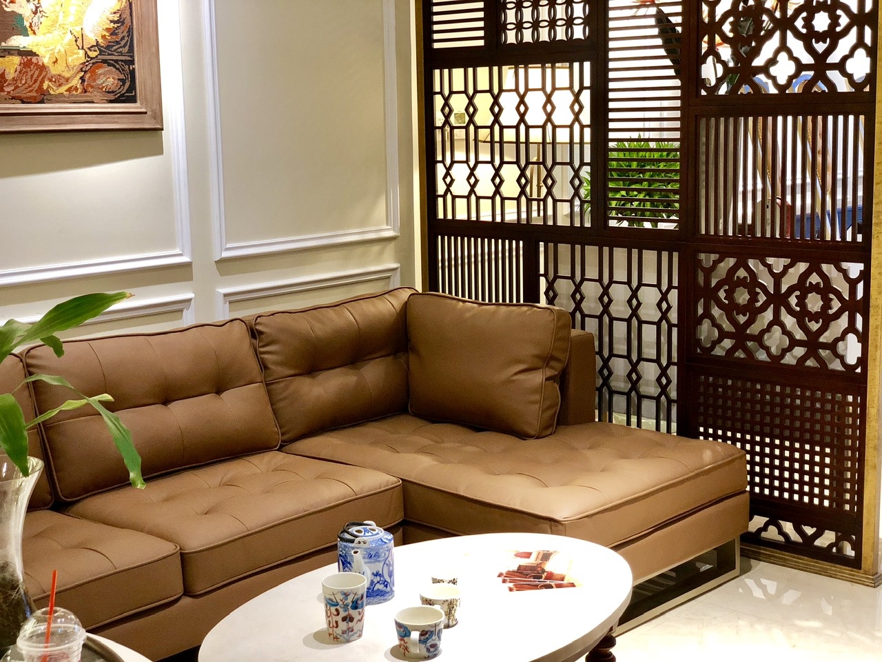 Khi kết hợp cùng bàn trà gỗ – mặt đá và vách ngăn gỗ chạm khắc, Sofa Cozy Corner càng tôn lên vẻ sang trọng, tạo nên một không gian sống vừa hiện đại vừa gần gũi. Mỗi chi tiết đều được chăm chút tỉ mỉ, khẳng định sự tinh tế trong thiết kế và thi công.