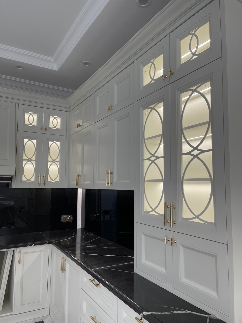 Tông màu trắng kem trang nhã, kết hợp cùng những đường phào chỉ tinh xảo, mang lại cảm giác sang trọng và đẳng cấp. Điểm nhấn nổi bật nằm ở hệ cánh tủ kính với hoạ tiết kim loại uốn lượn, vừa tạo hiệu ứng ánh sáng, vừa tăng chiều sâu cho không gian. Bên trong tủ được lắp đặt đèn led, giúp không gian bếp luôn lung linh và ấm áp.