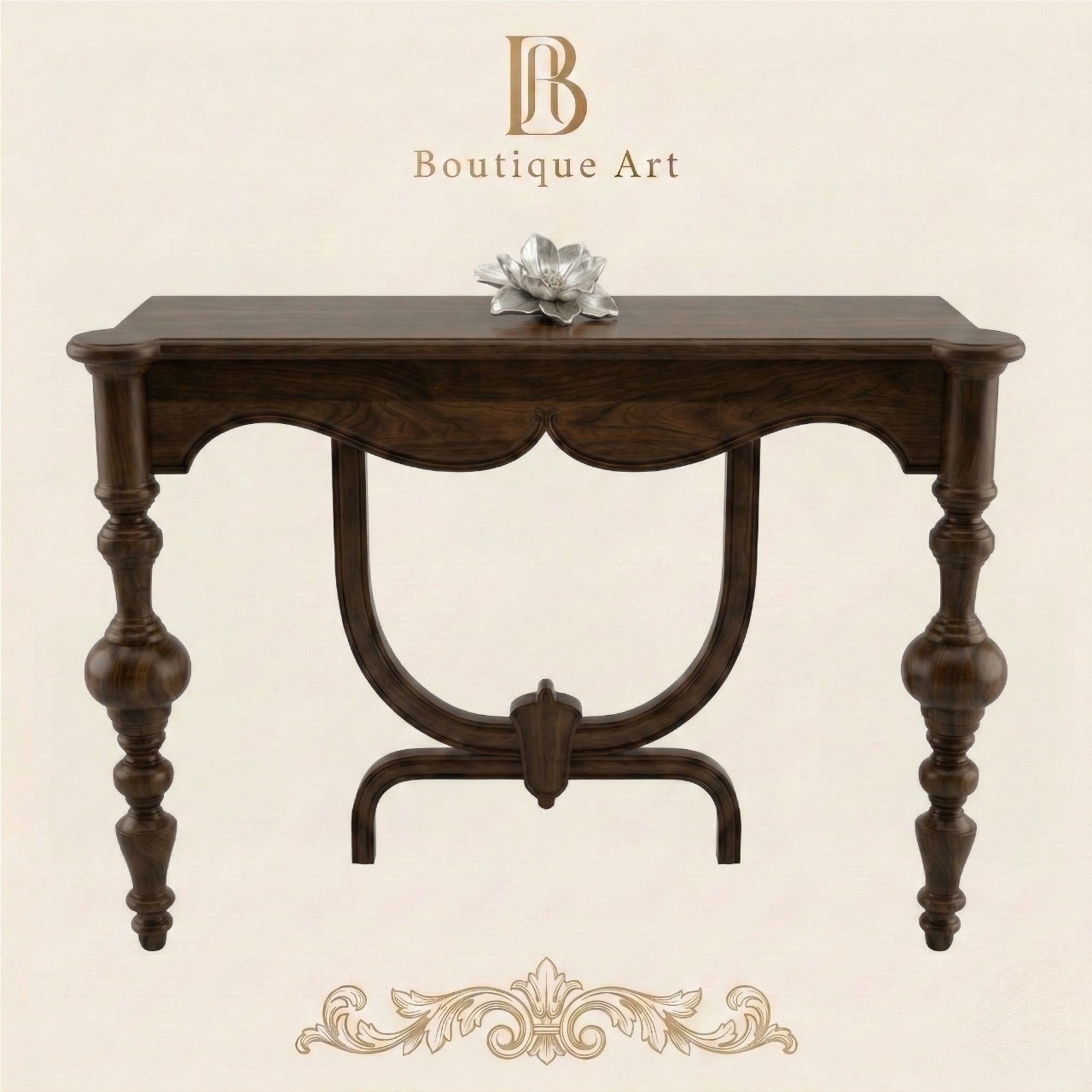 Bàn console được chế tác từ gỗ Walnut tự nhiên cao cấp, nổi bật với gam màu nâu trầm sang trọng cùng hệ vân gỗ mềm mại, mang đến cảm giác ấm áp và đẳng cấp cho không gian nội thất. Thiết kế lấy cảm hứng từ phong cách Art Décor kết hợp nét cổ điển châu Âu, thể hiện qua phần chân tiện thủ công tinh xảo và kết cấu uốn cong cân đối đầy tính nghệ thuật.